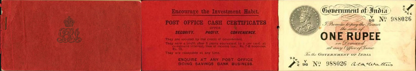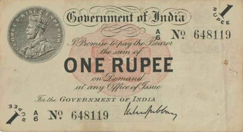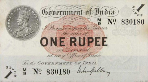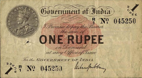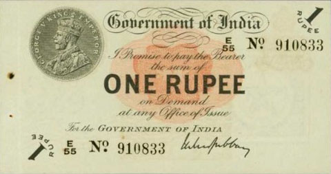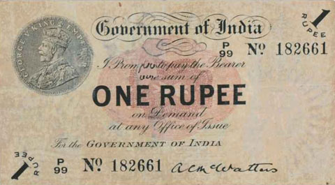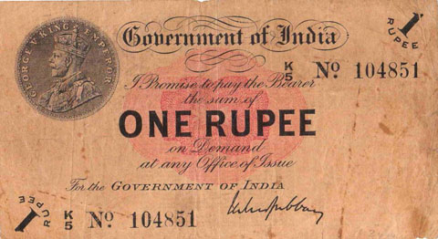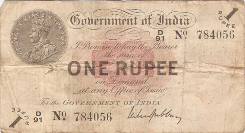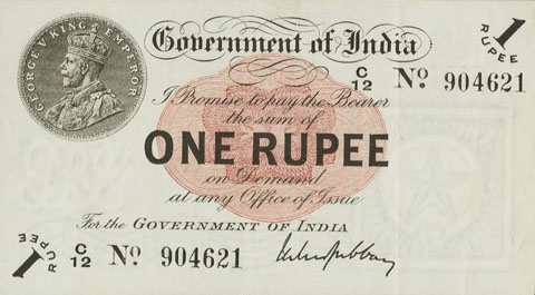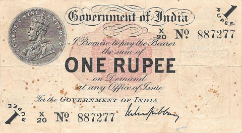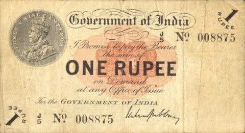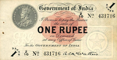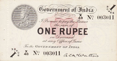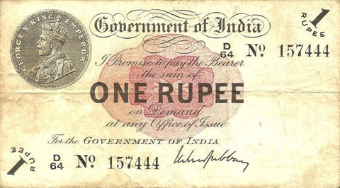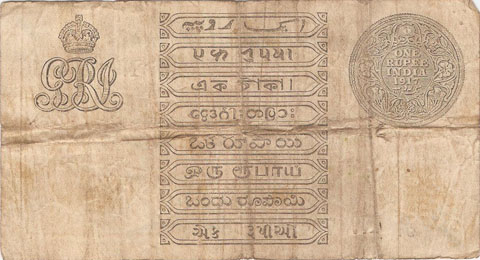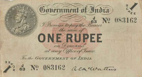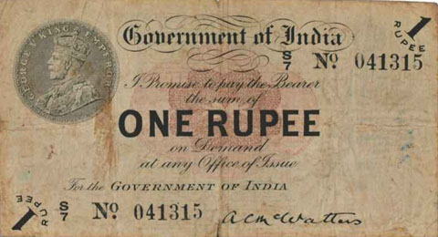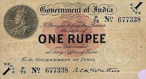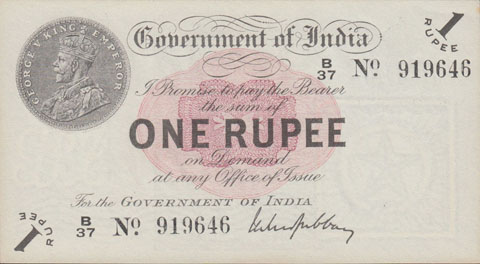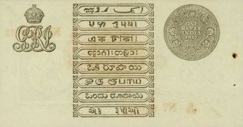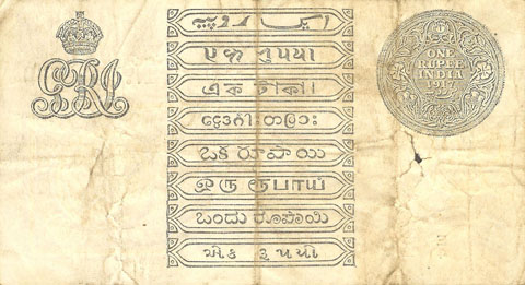 Released in late 1917 the One Rupee note has an effigy of a One rupee Coin depicting King George V and the value written in words in the centre. The signature of the note (The person who was Controller of Currency at the time) was found in the lower part of the note just off centre to the right. The Serial Number is displayed in 2 places lower left and upper right. The value 1 and the word RUPEE is in the lower left corner and the upper right. In words reading from the top "Government of India I promise to pay the bearer the sum of ONE RUPEE on demand at any office of issue for the GOVERNMENT OF INDIA". The watermark could be viewed in the lower right hand corner there are 2 types an explanation is below. Serial numbers were actually branch issue indicators as explained below. (Until universalisation was implemented in late 1918).The back of the note has the reverse of the One Rupee coin dated 1917 the Royal cipher for King George V, and has eight language panels in the various languages used in India. Urdu, Devanagari, Bengali, Oriya, Telugu, Tamil, Kannada, and Gujarati; Interestingly the language panel for the language in Gujarati (position 8 at the bottom) was incorrect as the correct term was substituted with Rupaya not Rupayo and was not corrected until universalisation came into being.