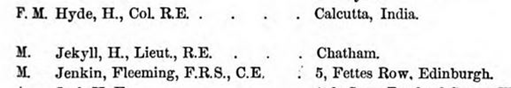 Professor Fleeming Jenkin was also a member of the STE. His name appears just below that of Jekyll and Hyde in the membership list. An excerpt of the names is attached below.