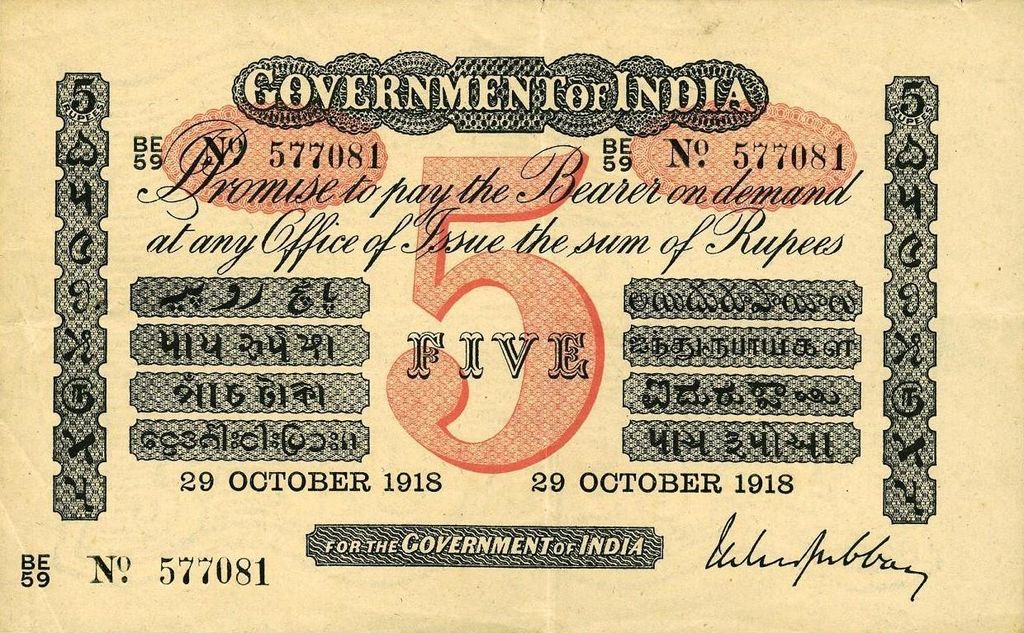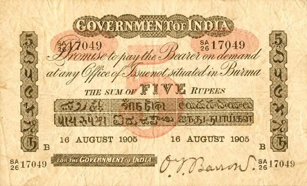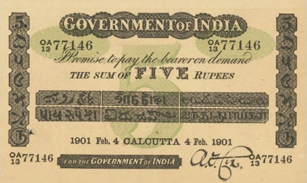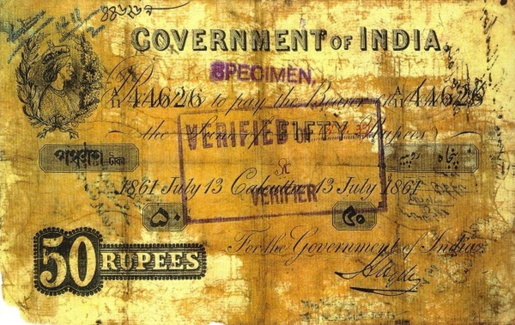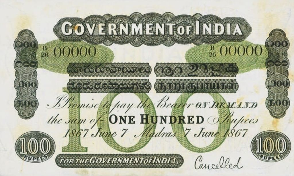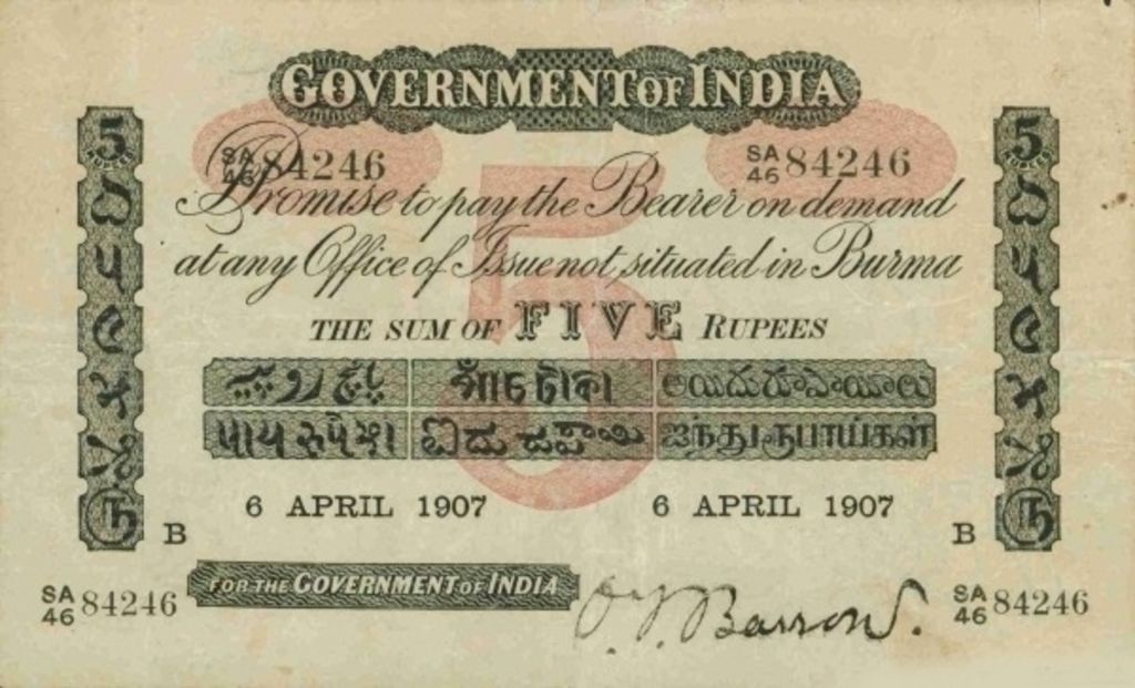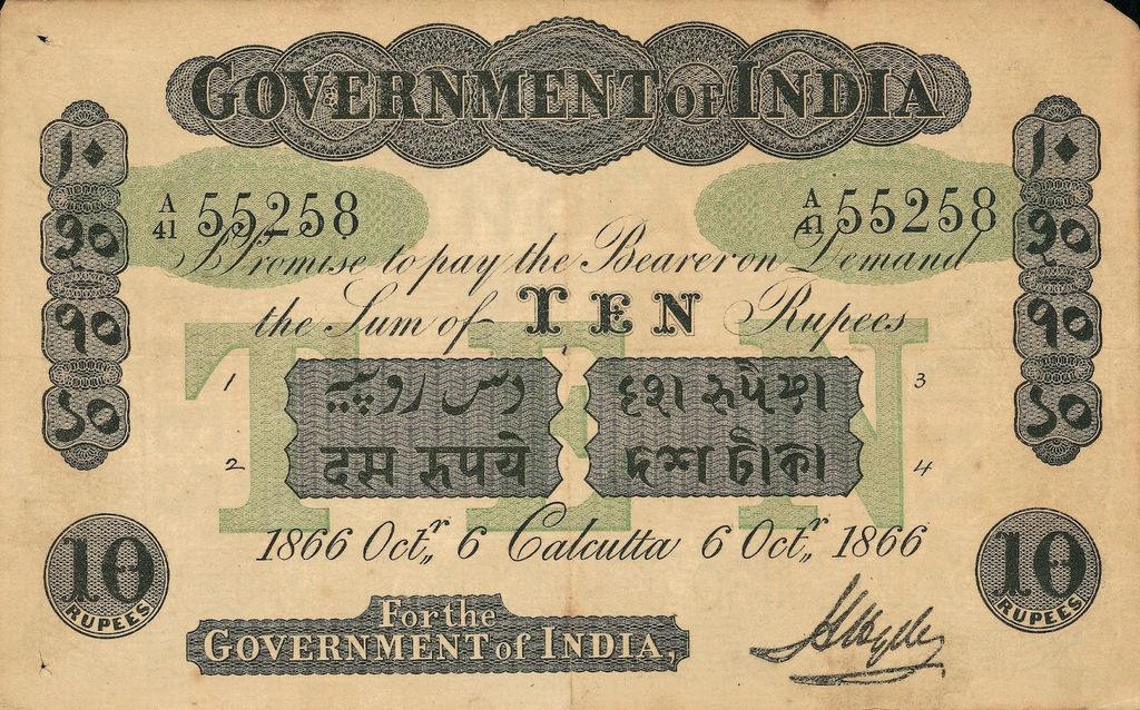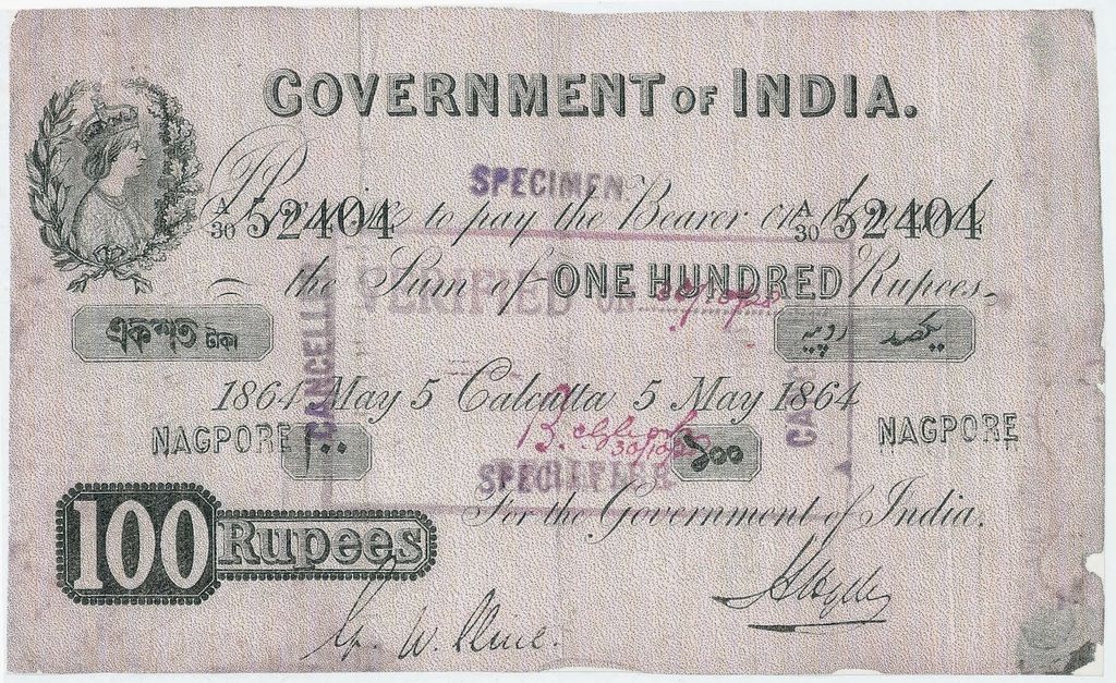 - 5 rupee. Specimen only dated 1858, it is assumed that no 5 rupee notes were issued for circulation.