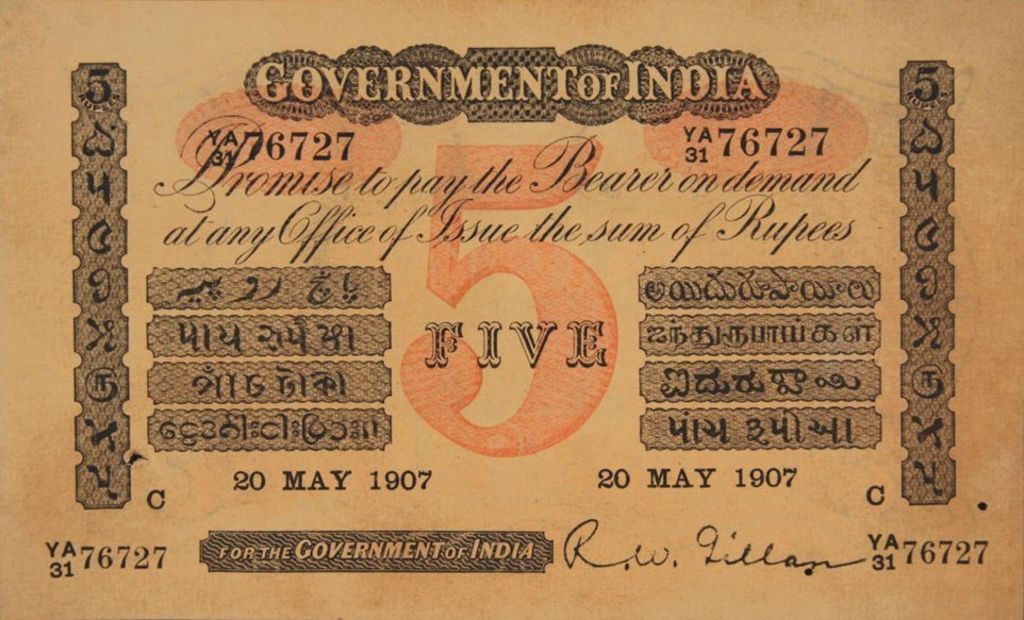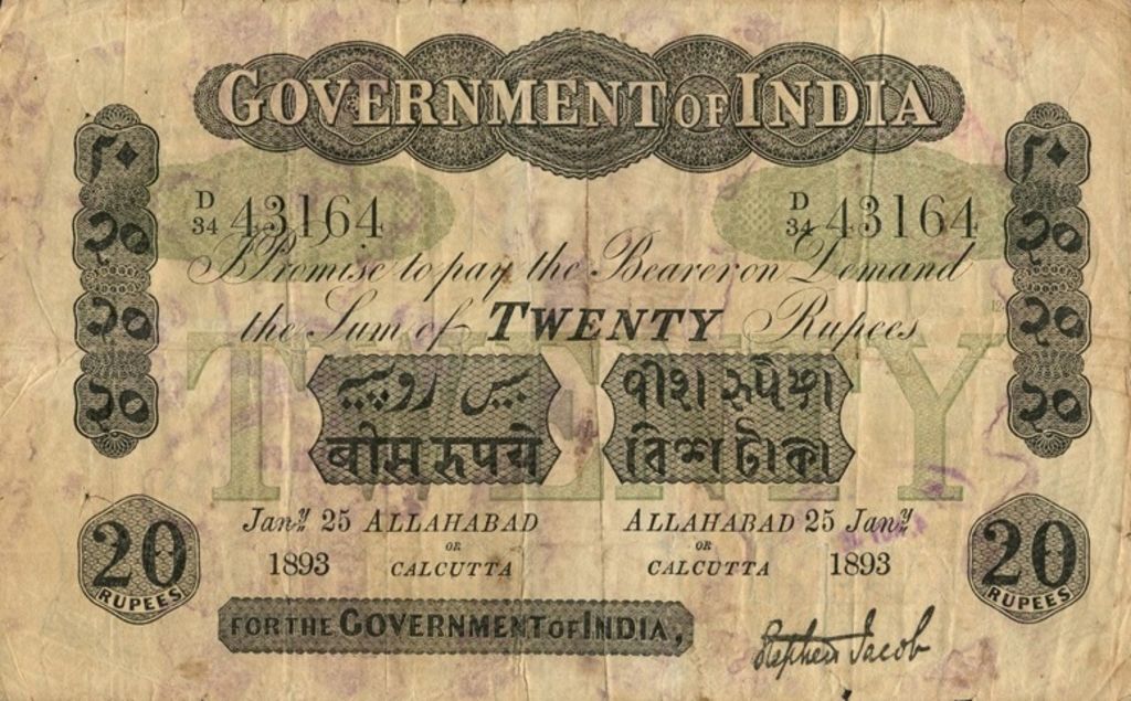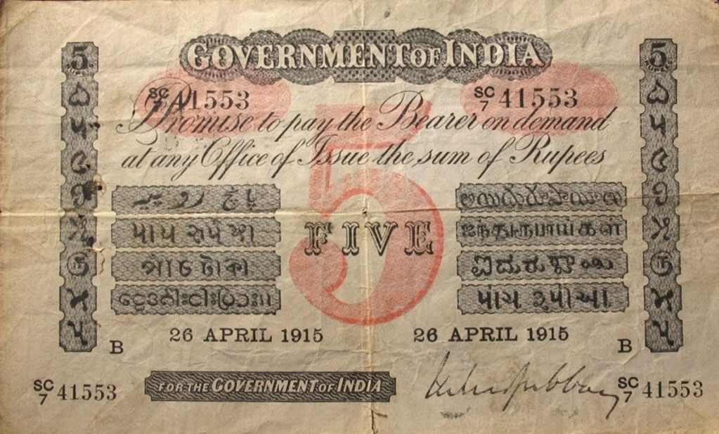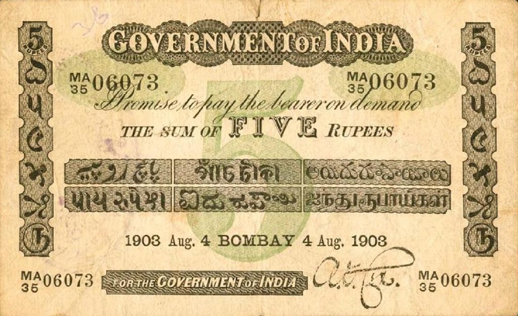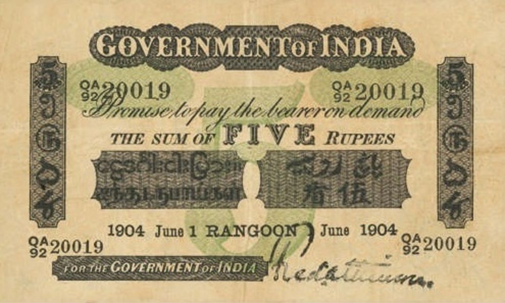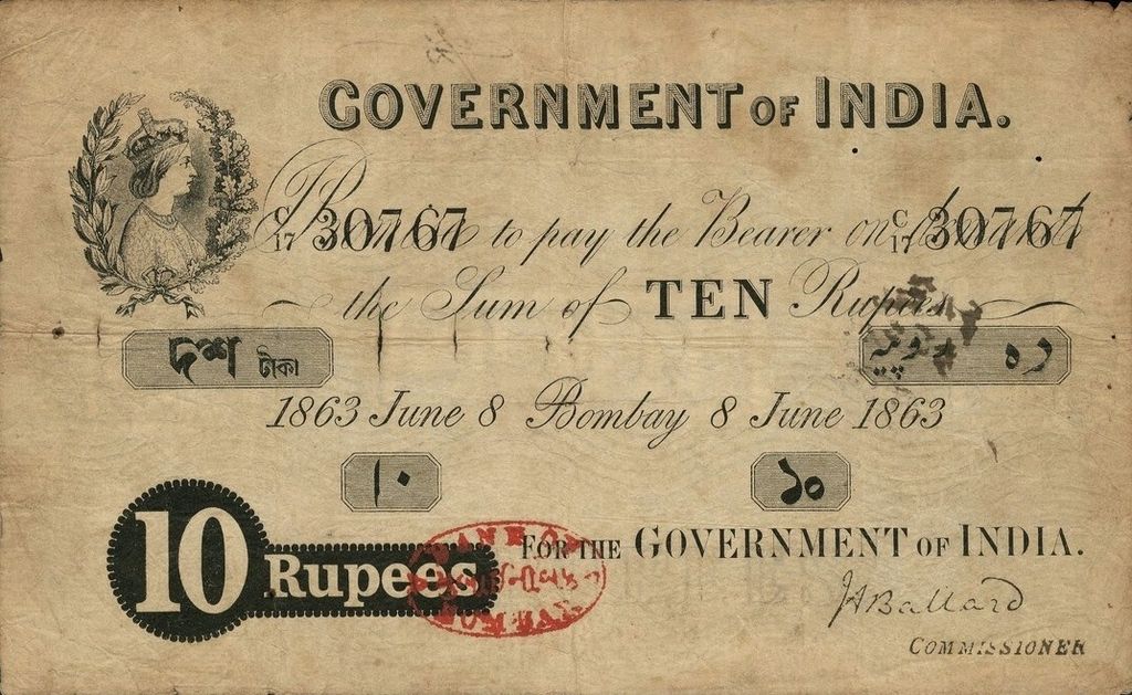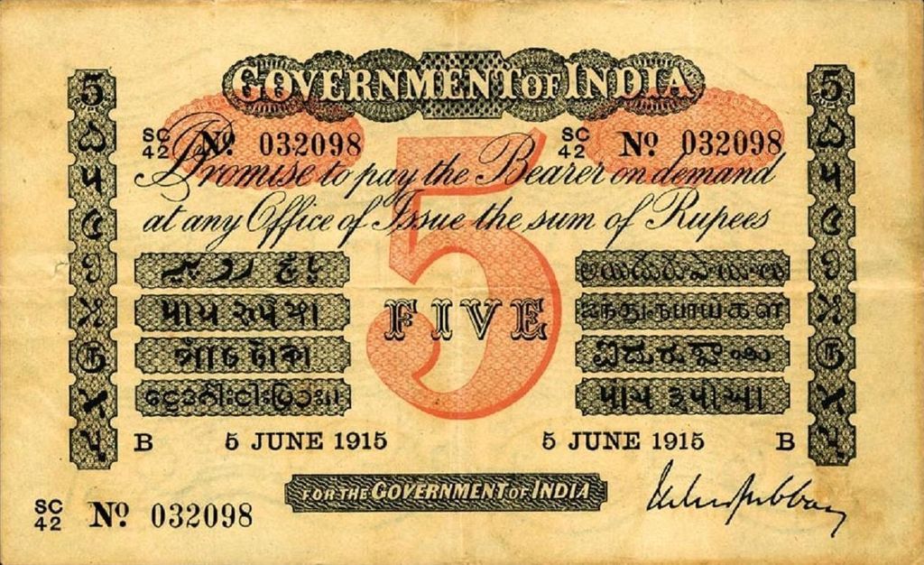 - 5 rupee. Specimen only dated 1858, it is assumed that no 5 rupee notes were issued for circulation.